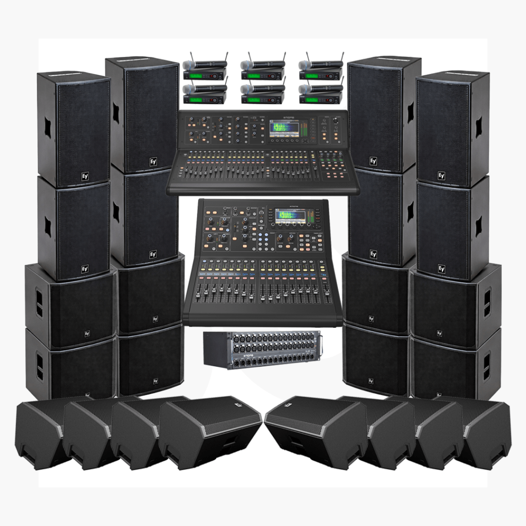Suitable for events with medium capacity DJ/band performers with high low sound SOUNDSYSTEM 20.000W 8 EV QRX 115 Passive Speaker 15″ 8 EV EKX 118 Active Subwoofer 18″ 8 EV ZLX 15 Active Speaker 15″ 6 Wireless Handheld Microphone 1 Midas M32R Digital Mixer 32 Ch 1 Midas M32 Live Digital Mixer 32 Ch 1 Midas DL 32 Stage Box Suitable for : Big Ballroom Concert